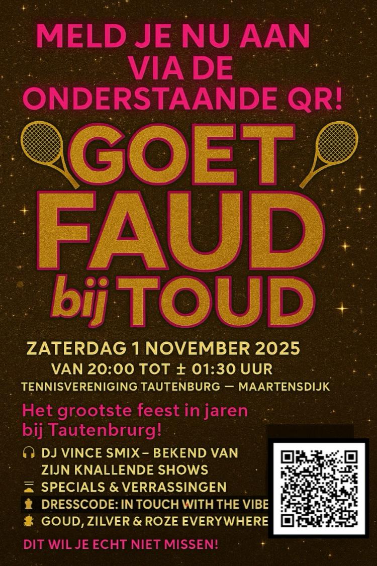 Op zaterdag 1 november verandert TPV Tautenburg in het decor van het grootste feest in jaren: GOET FAUD bij TOUD! Van 20:00 tot ± 01:30 uur gaan de voetjes van de vloer in Maartensdijk.